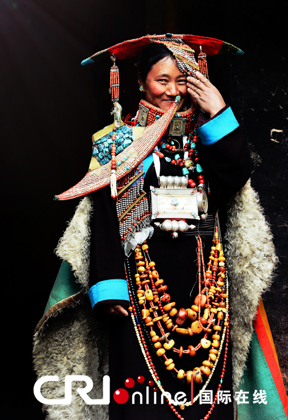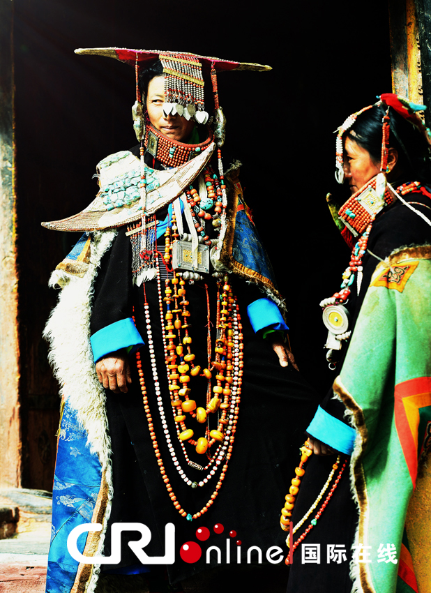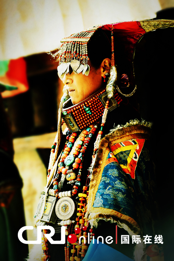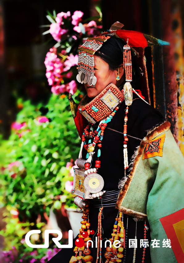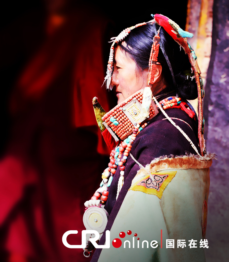 崇尚善良與自由的普蘭人為了紀念這位賢良的王妃,用自己手工縫制的藏袍和一串串名貴的綠松石、蜜蠟、珍珠和寶石做成了眼前這靚麗的飛天服飾,代代相傳,綿延至今。