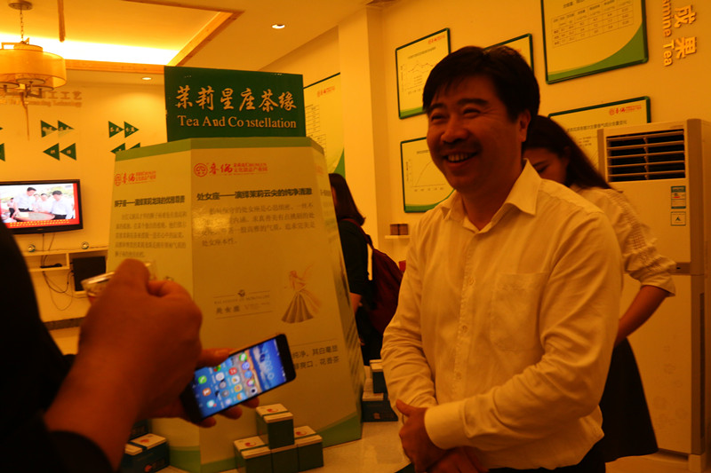 福建春倫集團(tuán)董事長兼黨委書記傅天龍接受記者采訪,背后是星座茶宣傳區(qū)(吳海波 攝)