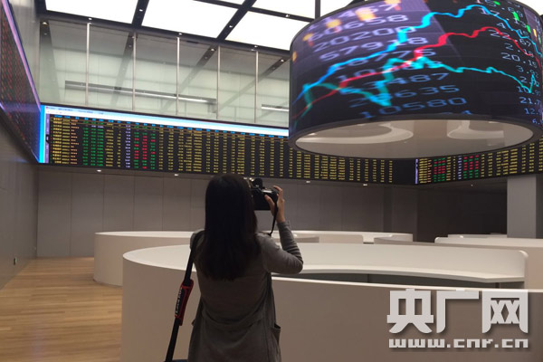 一名記者在尚未開放的中西部商品交易中心的交易大廳拍攝采訪