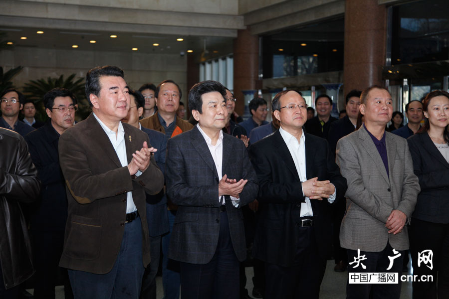 國家新聞出版廣電總局局長蔡赴朝(左二)、中央人民廣播電臺臺長王求(左一)、國務(wù)院應(yīng)急辦主任陳建安(左三)(央廣網(wǎng)記者 趙娜娜 攝)