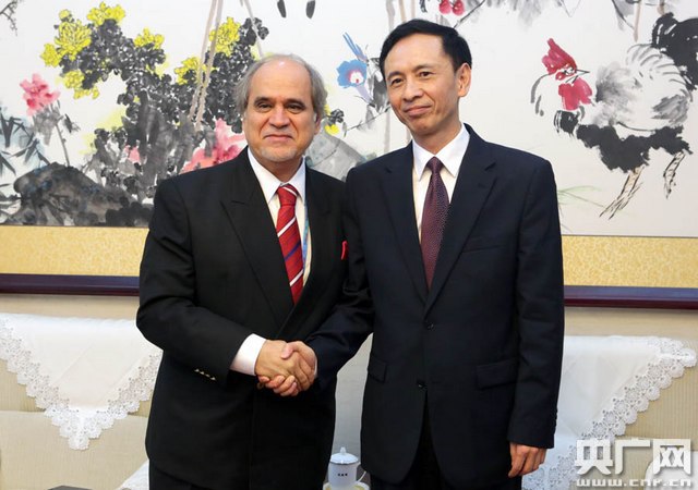 央人民廣播電臺(tái)臺(tái)長閻曉明(右)會(huì)見亞廣聯(lián)秘書長孟塔基(央廣網(wǎng) 李雪南/攝)