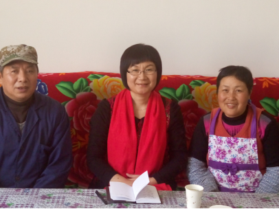 2017年1月20日,在新疆且末縣托格拉克勒克鄉(xiāng)蘭干村村民王貴模家中,新疆網(wǎng)編輯薛玲(中)采訪完后與王貴模夫婦合影。陳雪茹 攝