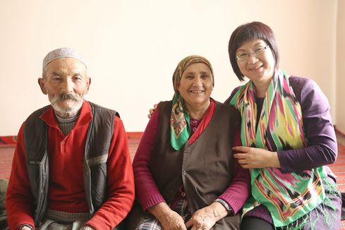 2017年1月21日,在新疆若羌縣鐵干里克鎮(zhèn)果勒吾斯塘村村民則威代姆·托乎提家中,新疆網(wǎng)編輯薛玲采訪完后與之結為“親戚”,臨別時與則威代姆·托乎提夫婦合影。王勇強 攝