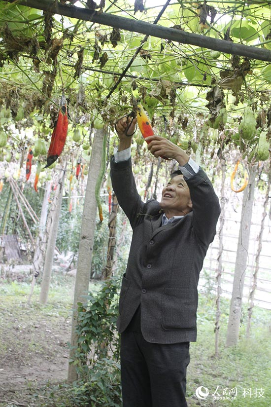 正在庭院里忙碌的孫六生是一位有著50多年農(nóng)藝經(jīng)驗的老農(nóng)藝師,如意吊瓜是他去年剛從江西引進的新品種。