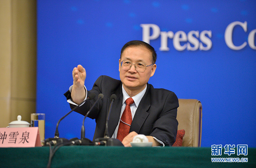 3月7日,十二屆全國人大五次會議舉行記者會,農(nóng)業(yè)部部長韓長賦、副部長張?zhí)伊志汀巴七M(jìn)農(nóng)業(yè)供給側(cè)結(jié)構(gòu)性改革”的相關(guān)問題回答中外記者的提問。圖為記者會主持人鐘雪泉。新華網(wǎng)/中國政府網(wǎng) 孫韜 攝