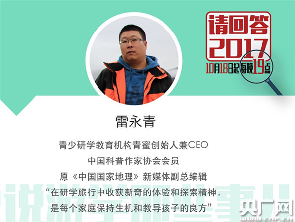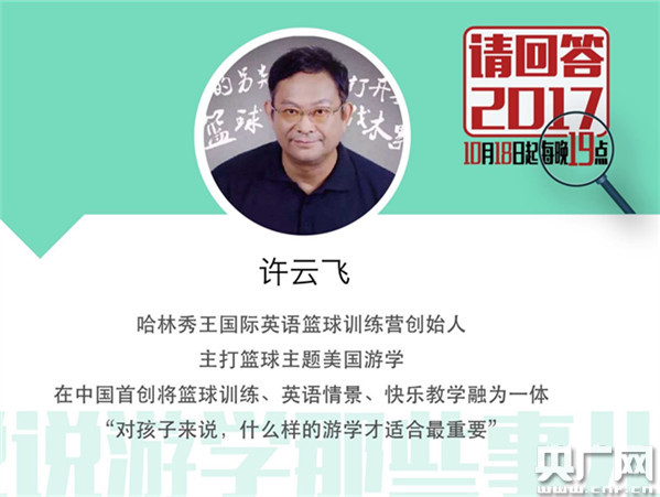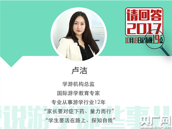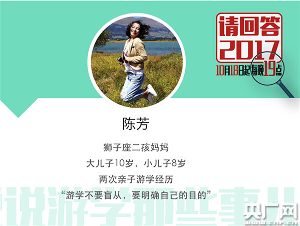 10月23日19:00—20:30,中國(guó)之聲十九大特別節(jié)目《請(qǐng)回答2017》推出第六期《說說游學(xué)那些事兒》。從事游學(xué)行業(yè)12年、國(guó)際游學(xué)教育專家盧潔,兩次親子游學(xué)經(jīng)歷、獅子座二孩媽媽陳芳,主打籃球主題、國(guó)際英語籃球訓(xùn)練營(yíng)創(chuàng)始人許云飛,在研學(xué)旅行收獲新奇體驗(yàn)、青少研學(xué)教育機(jī)構(gòu)CEO雷永青將做客直播間!
