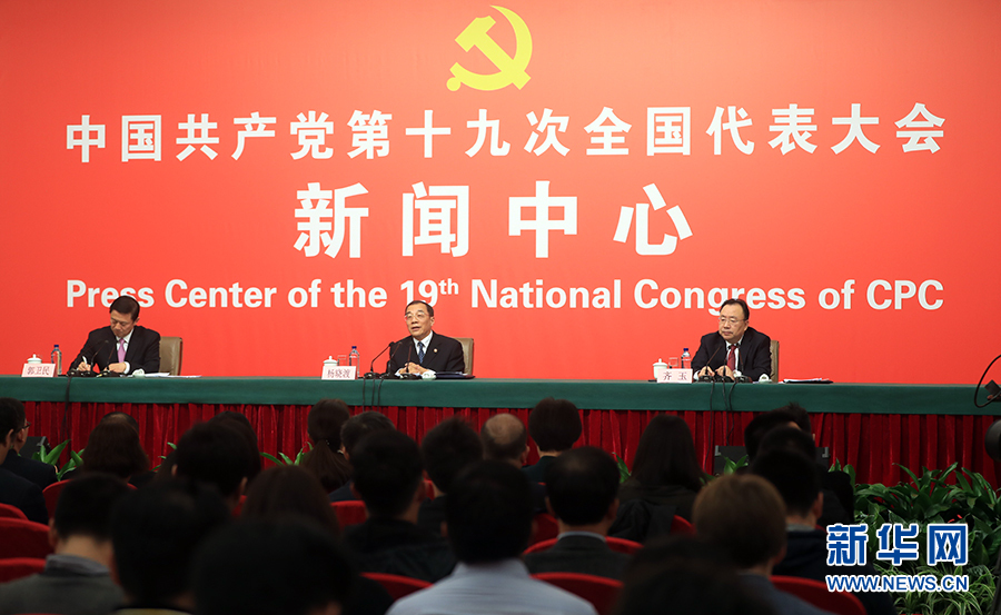 10月19日,十九大新聞中心舉行記者會,邀請中紀委、中組部負責(zé)人介紹黨的建設(shè)和全面從嚴治黨相關(guān)情況。圖為記者會現(xiàn)場。新華網(wǎng) 郝廣鵬攝