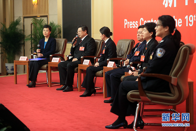 10月19日,十九大新聞中心舉辦集體采訪,邀請政法戰(zhàn)線代表談全面推進(jìn)依法治國。圖為采訪現(xiàn)場。新華網(wǎng) 郝廣鵬攝