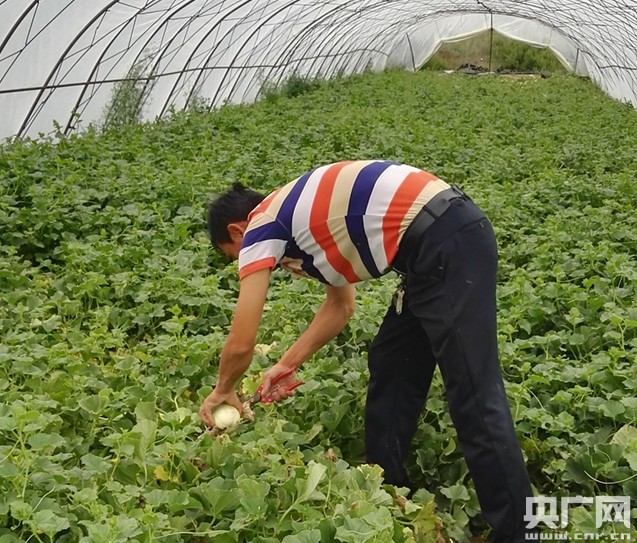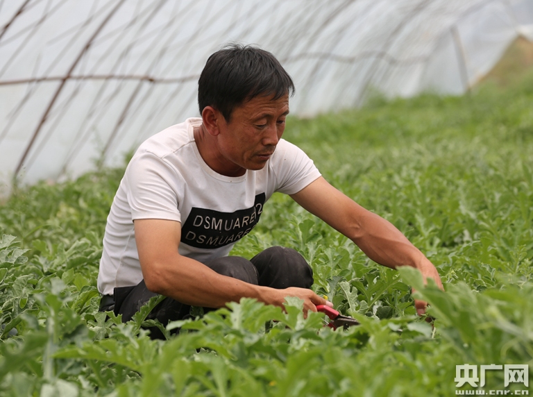 “選擇這種變黃色的,咱們今天總共是摘300斤!鼻宄,趁著日頭不大,拱棚里涼快,趙記塘村村民劉國民握著把紅色剪刀,在綠色的秧蔓間,挑撿成熟的香瓜,不再擔心風沙堵門,“清晨在田間地頭轉轉,空氣特別好,能讓你忘掉好多煩惱的事情!眲傉碌南愎箱伭艘坏,等著被擦凈、裝箱。劉國民感慨,以前我們這個地方全是黃沙,風沙好大的,像這個棚根本就搭不住。