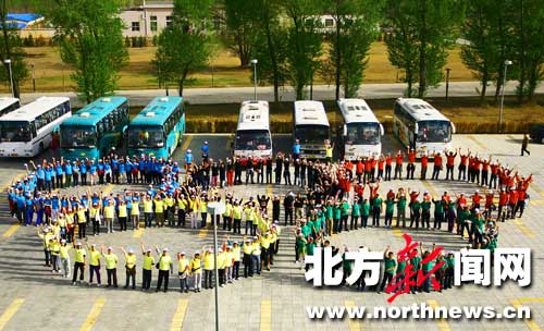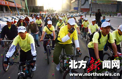 5月1日6時許,來到自行車首府一日游的集合地新華廣場時,報名參加自行車首府一日游的500名隊員已經(jīng)到場。身穿紅、黃、藍、綠、黑奧運五環(huán)顏色T恤的隊員個個精神抖擻。做完熱身運動,檢查了一遍車輛后,隊員們根據(jù)所穿衣服的顏色組成隊列,等候出發(fā)的命令。隨著一聲令下,隊員爭先恐后地出發(fā)了。
