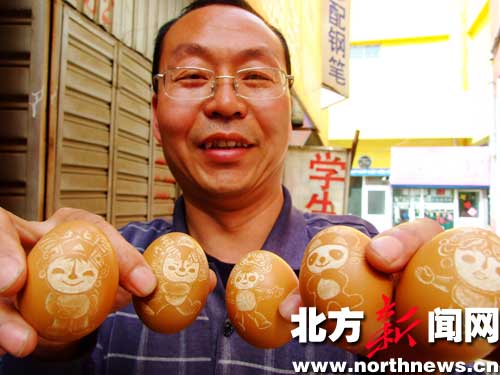 中廣網呼和浩特5月6日消息 內蒙古包頭市蛋雕愛好者李廣晨展示蛋雕福娃。李廣晨從2005年開始從事蛋雕創(chuàng)作,內容涵蓋人物、肖像、生肖等。今年是奧運年,李廣晨利用業(yè)余時間創(chuàng)作了奧運福娃蛋雕作品,表達對2008北京奧運會的祝福。(李強)