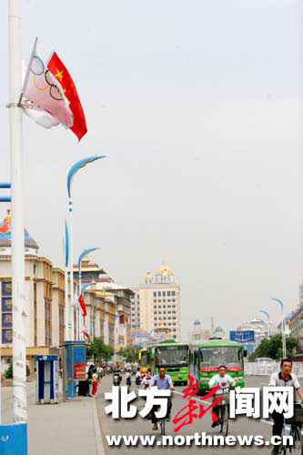中廣網(wǎng)呼和浩特6月19日消息 記者近日在呼和浩特市的一些街道上看到,道路兩旁掛起了五星紅旗和奧運(yùn)會(huì)會(huì)徽、會(huì)旗,為即將在內(nèi)蒙古進(jìn)行的奧運(yùn)圣火傳遞活動(dòng)營(yíng)造出莊嚴(yán)喜慶的氛圍。(孫慧)