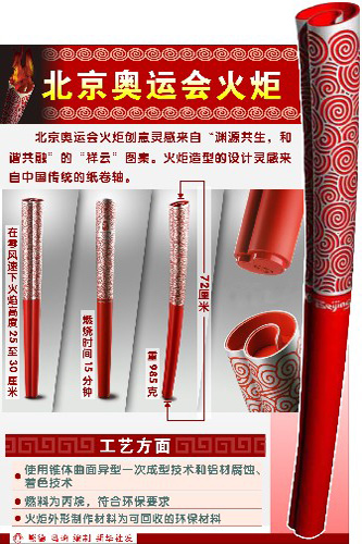 北京奧運(yùn)會(huì)火炬長72厘米,重985克,燃燒時(shí)間超過15分鐘,能在每小時(shí)65公里的強(qiáng)風(fēng)和每小時(shí)50毫米雨量的情況下保持燃燒;鹧娓叨25至30厘米,在強(qiáng)光和日光情況下均可識(shí)別和拍攝。整個(gè)火炬高雅華麗,內(nèi)涵厚重,帶有濃郁的中國特色,和諧地將中國文化與奧林匹克精神結(jié)合在一起。其所蘊(yùn)含的“淵源共生,和諧共融”理念充分是對(duì)奧林匹克精神和奧林匹克圣火內(nèi)涵的一次獨(dú)特詮釋。祥云、漆紅、紙卷軸等中國元素的融入,使得古老的東方文明和現(xiàn)代的奧林匹克精神再一次完美結(jié)合,迸發(fā)出耀眼的火花。