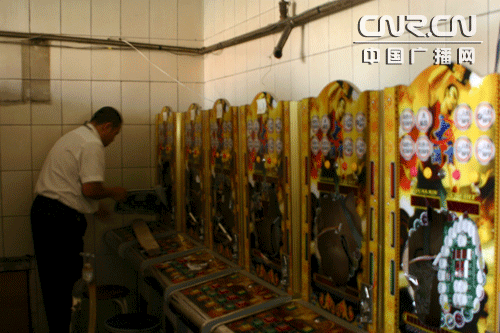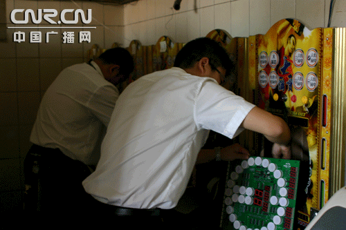 專(zhuān)項(xiàng)行動(dòng)的工作人員在現(xiàn)場(chǎng)將黑網(wǎng)吧的游戲機(jī)(賭博機(jī))搗毀。(攝影 王芳)