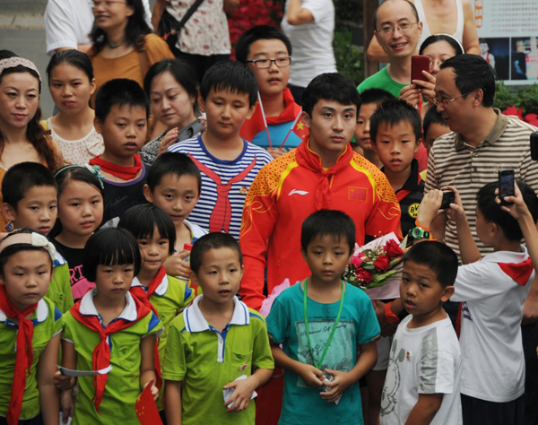 9月7日,迎著薩克斯與小提琴合奏出的輕快音樂,草堂小學(xué)的師生迎來了期盼已久的奧運(yùn)會(huì)冠軍馮喆?吹叫哪恐械墓谲姼绺,粉絲團(tuán)的弟妹們?cè)僖舶崔嗖蛔?nèi)心的激動(dòng)和喜悅,他們一擁而上為心中的偶像馮喆哥哥及其父母送上芬芳的鮮花,并為他們佩戴上鮮艷的紅領(lǐng)巾。“歡迎你回家,‘小胖’哥哥!”,成都草堂小學(xué)的小朋友們熱情地呼喊著。