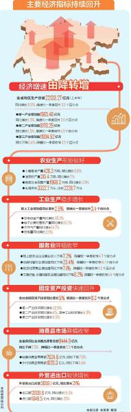 其中,規(guī)模以上工業(yè)增加值同比增長2.5%,全社會固定資產(chǎn)投資同比增長5%,分別比一季度回升3.4和9.3個百分點。社會消費品零售總額雖然仍為下降,但降幅已比一季度收窄5.5個百分點。