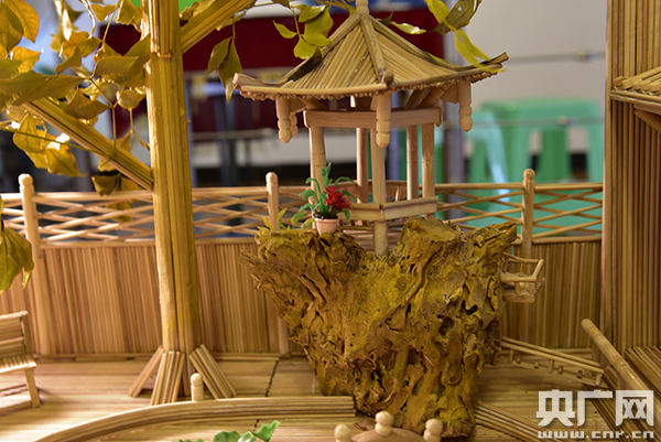 聽起來似乎很簡單,做起來就沒這么容易了。余航說,在制作的過程中,有許多的細(xì)節(jié)需要注意,每一個步驟都需要細(xì)心和耐心,其中,最讓余航記憶深刻的是制作屋頂?shù)摹褒垺毙脱b飾!捌鸪跸胫媚绢^來雕,但覺得不協(xié)調(diào),后來還是選擇用竹筷進(jìn)行雕琢,感覺還是很成功!
