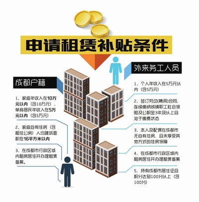 據(jù)了解,成都市戶籍居民申請租賃補貼,須同時符合以下條件:1、家庭年收入在10萬元以內(nèi)(含10萬元)、單身居民年收入在5萬元以內(nèi)(含5萬元);2、主申請人具有成都市戶籍;3、家庭自有住房(含租住公房)人均建筑面積在16平方米以內(nèi),且未享受其他方式的住房保障;4、在成都市行政區(qū)域內(nèi)租房居住并辦理租賃備案。