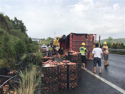 山西省永濟(jì)市的貨車司機(jī)晉軍平出門不順,7月16日早上,他從山西運(yùn)城拉往云南保山的9噸桃子,因?yàn)榉嚾鲈诹藦V元市境內(nèi)的高速路上。“算了,這些桃子不要了!睍x軍平不知所措。但現(xiàn)場(chǎng)處理事故的高速交警卻告訴他,“把好的桃子撿起來,這些桃子已經(jīng)賣掉了!