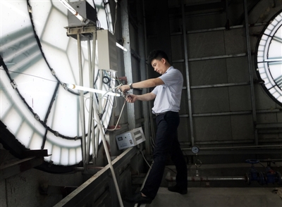 工作人員正在調(diào)試彭州鐘樓的燈光 攝影記者 張士博