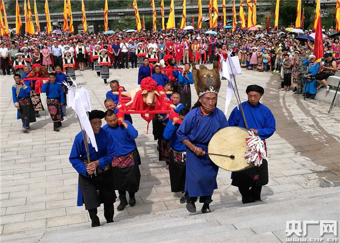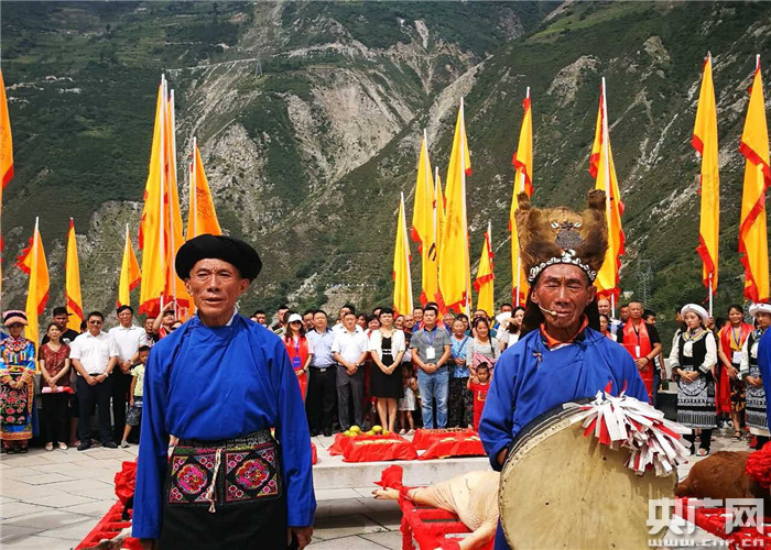 上午10時,汶川縣委書記張通榮宣布活動正式開始。隨后,盛裝的釋比帶領(lǐng)著由上百人組成的祭祀隊伍開始了莊嚴隆重的祭祀活動,在主祭壇向華夏始祖大禹獻上了三牲貢品……