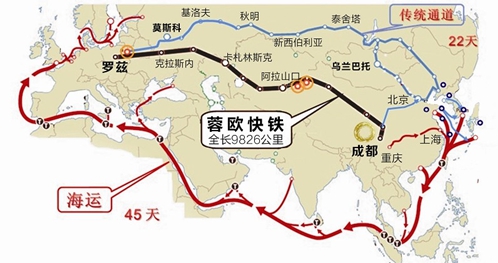 中國建設(shè)絲綢之路經(jīng)濟(jì)帶是在總結(jié)歐亞發(fā)展歷史和現(xiàn)實(shí)之后制定的一個互利共贏的國家戰(zhàn)略。蓉歐快鐵的誕生及其發(fā)展,不僅使其本身冉冉上升為全球經(jīng)濟(jì)大動脈,而且使得成都迅速成為西部經(jīng)濟(jì)之紐,夯實(shí)成都絲綢之路經(jīng)濟(jì)帶戰(zhàn)略地位。在城市間互聯(lián)互通和國家“一帶一路”戰(zhàn)略的機(jī)遇下,成都將建成連接歐洲和泛亞的交通樞紐,由內(nèi)陸變口岸,盆地變高地。(謝逸飛)
