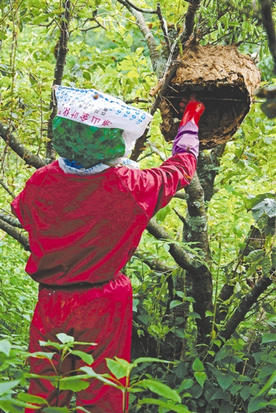 “難道沒有危險(xiǎn)嗎?”張正順笑著說:“你不招惹它就行了,馬蜂是不會主動(dòng)攻擊人的。我們這兒家家都養(yǎng)過蜂,沒人怕它們!奔幢闳绱,但這些獵蜂人依然經(jīng)常被馬蜂蜇傷。李明松扶起衣袖,手臂上一個(gè)傷疤清晰可見,是被指頭大小的土琴蜂蜇傷的,這種野蜂毒性很強(qiáng),他笑著說,“每年要被野蜂蜇10多次,感覺很平常,只要涂點(diǎn)藥酒,幾天就好了!
