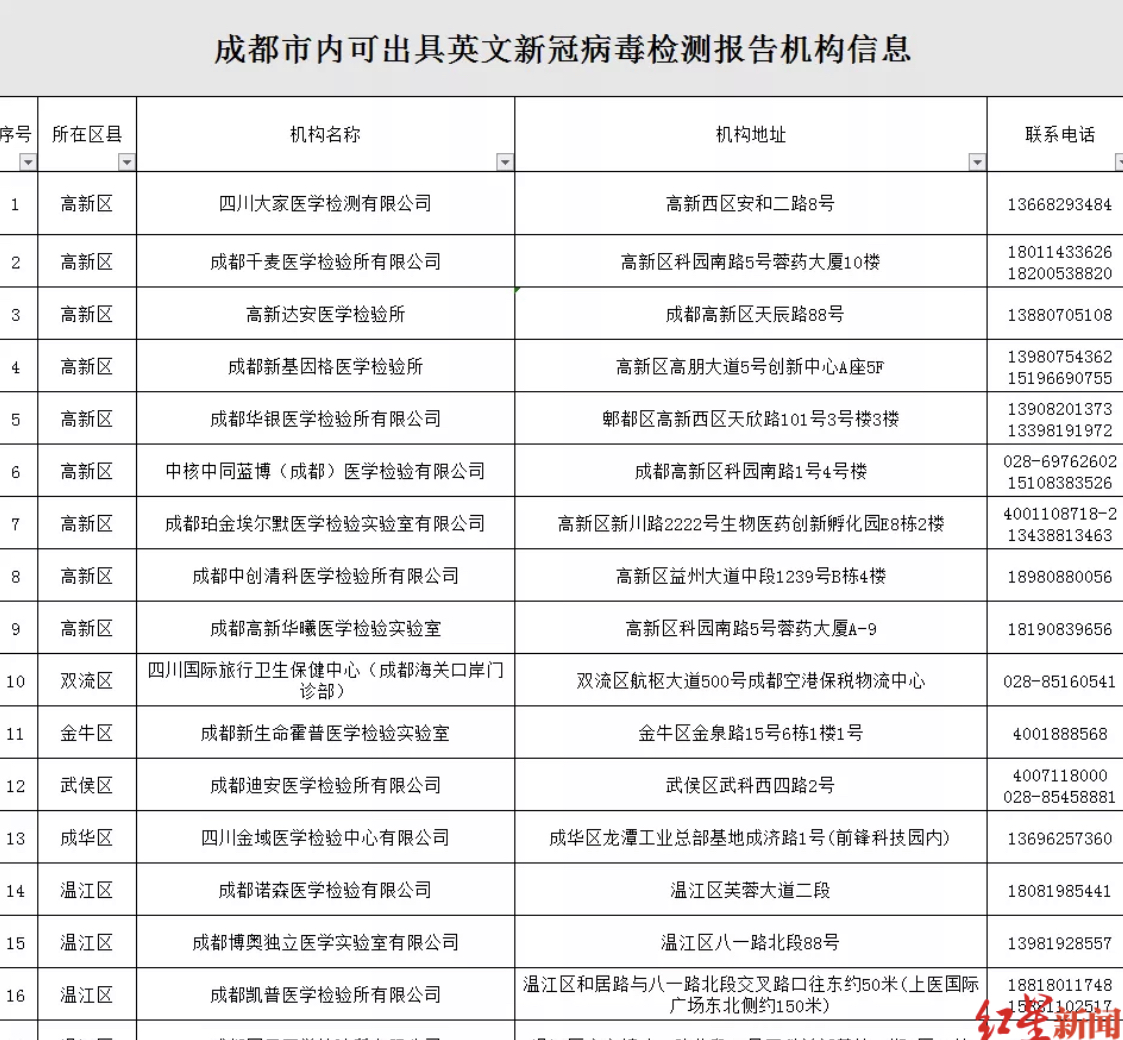 紅星新聞?dòng)浾邚某啥际行l(wèi)健委獲悉,目前我市有17家新冠病毒核酸檢測(cè)機(jī)構(gòu),可出具英文版檢測(cè)報(bào)告書(shū)。
