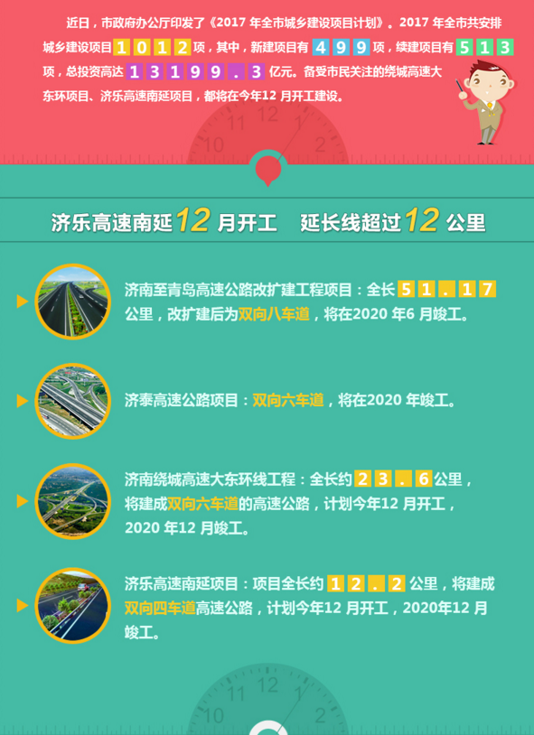 齊魯網(wǎng)3月10日訊 記者從濟(jì)南政府網(wǎng)獲悉,2017年濟(jì)南全市共安排城鄉(xiāng)建設(shè)項(xiàng)目1012項(xiàng),其中,新建項(xiàng)目499項(xiàng),續(xù)建項(xiàng)目513項(xiàng),總投資13199.3億元,2017年度計(jì)劃投資3389.3億元。包括城市出入口整治項(xiàng)目11項(xiàng),年度投資60.2億元;非貫通路、瓶頸路整治項(xiàng)目25項(xiàng),年度投資44.6億元;護(hù)城河沿線游步道貫通項(xiàng)目1個(gè),年度投資1億元;城鄉(xiāng)基礎(chǔ)設(shè)施項(xiàng)目260項(xiàng),年度投資562.9億元(其中圍繞治霾工作,重點(diǎn)安排了節(jié)能減排及新能源供暖項(xiàng)目22項(xiàng),年度投資34.7億元);水生態(tài)建設(shè)項(xiàng)目23項(xiàng),年度投資52.7億元;城鄉(xiāng)環(huán)境綜合整治項(xiàng)目44項(xiàng), 年度投資25.1億元;房地產(chǎn)開發(fā)項(xiàng)目423項(xiàng),年度投資1794.7億元;城市更新項(xiàng)目121項(xiàng),年度投資677.3億元;社會(huì)事業(yè)項(xiàng)目89項(xiàng),年度投資108.4億元;其他項(xiàng)目15項(xiàng),年度投資62.4億元。