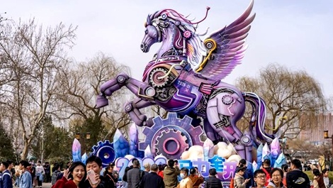 春節(jié)假期,濟(jì)南市第45屆天下第一泉迎春花燈會(huì)“馬力全開”燈組在大明湖南岸正誼廣場(chǎng)持續(xù)“圈粉”。