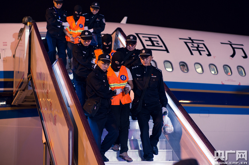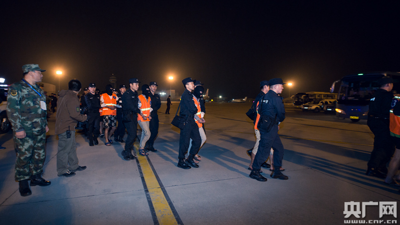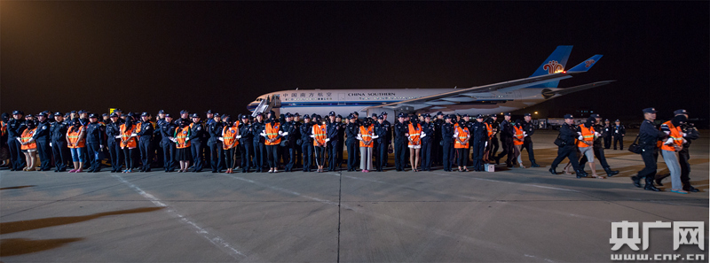 圖為犯罪嫌疑人被押解下飛機(jī)。 -