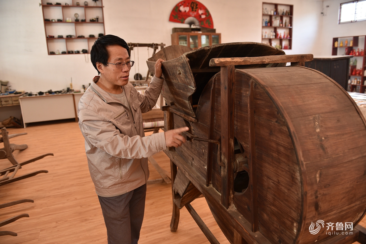 在山東日照東港區(qū)河山鎮(zhèn)大暖帳村,村民馬鳴正在他籌建的民俗博物館內(nèi),介紹一輛木制手推車。今年49歲的馬鳴,從90年代初開始收藏農(nóng)村老物件,20多年來,他耗資20多萬元,建起了一個民俗博物館。