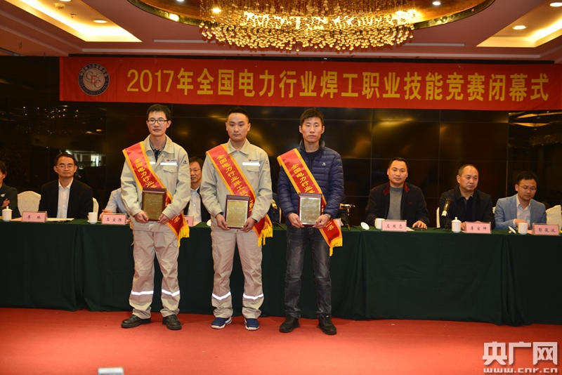 趙振亮(中)領(lǐng)取全國(guó)電力行業(yè)焊工職業(yè)技能競(jìng)賽冠軍證書
