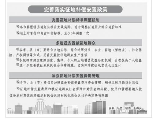 對(duì)于社會(huì)普遍關(guān)注的征地補(bǔ)償安置,《意見(jiàn)》也作出明確規(guī)定。在征地補(bǔ)償標(biāo)準(zhǔn)方面,各市要根據(jù)當(dāng)?shù)亟?jīng)濟(jì)社會(huì)發(fā)展實(shí)際,適時(shí)調(diào)整征地區(qū)片綜合地價(jià)標(biāo)準(zhǔn);地上附著物和青苗補(bǔ)償標(biāo)準(zhǔn),至少5年調(diào)整一次。關(guān)于被征地群眾的安置,各市、縣(市)要綜合運(yùn)用貨幣、農(nóng)業(yè)、留地(留物業(yè))、社會(huì)保險(xiǎn)、產(chǎn)權(quán)調(diào)換等方式,妥善安置被征地群眾生產(chǎn)生活;積極探索建立兼顧國(guó)家、集體、個(gè)人的土地增值收益分配機(jī)制,合理提高個(gè)人收益;進(jìn)一步完善被征地農(nóng)民社會(huì)保障措施,切實(shí)保障被征地農(nóng)民長(zhǎng)遠(yuǎn)生計(jì)。此外,加強(qiáng)征地補(bǔ)償安置費(fèi)用管理,各市、縣(市)要切實(shí)加強(qiáng)征地補(bǔ)償安置費(fèi)用資金管理,確保及時(shí)足額撥付到位;征地補(bǔ)償安置費(fèi)用和被征地群眾社會(huì)保障補(bǔ)貼資金的分配、使用和管理要納入被征地農(nóng)村集體經(jīng)濟(jì)組織村民會(huì)議或村民代表會(huì)議討論決定事項(xiàng)范圍;被征地農(nóng)村集體經(jīng)濟(jì)組織要嚴(yán)格執(zhí)行村務(wù)公開(kāi)、財(cái)務(wù)公開(kāi)和民主理財(cái)制度,確保征地補(bǔ)償安置費(fèi)用和被征地群眾社會(huì)保障補(bǔ)貼資金的分配、使用和管理合法合規(guī)、公平合理、公開(kāi)透明。