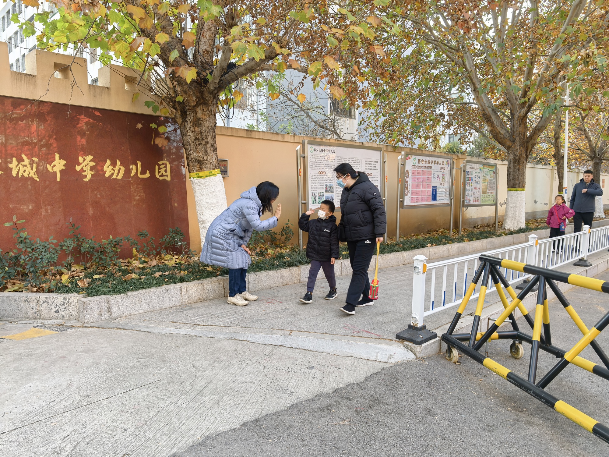 清晨,園長在校門口迎接小朋友入園