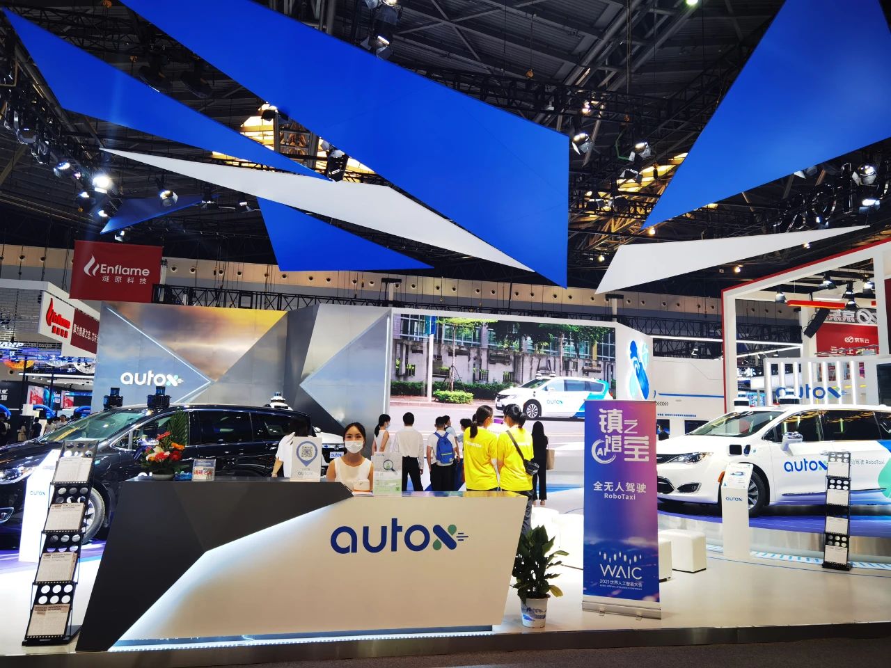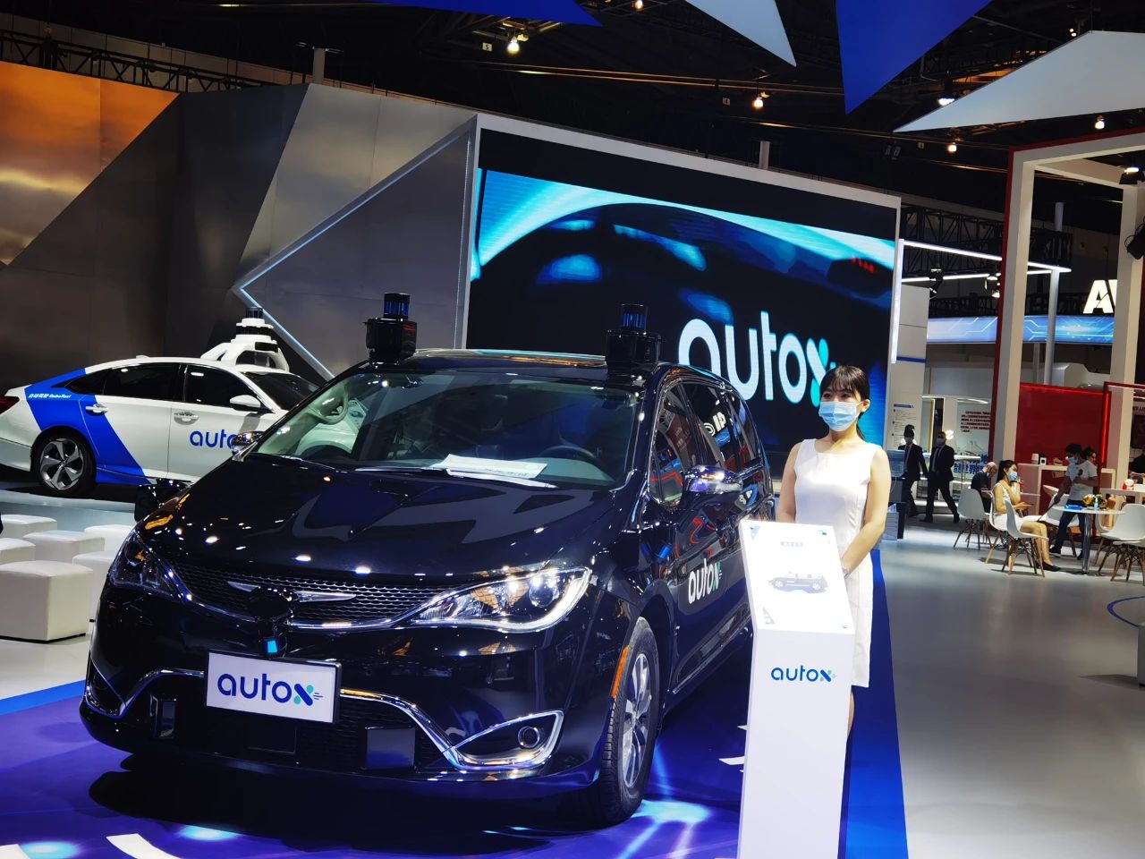 中國無人駕駛公司AutoX的展臺位于主會場的C位,展臺展出了三款搭載第五代系統(tǒng)的全無人RoboTaxi,包括一黑一白兩臺“大捷龍”MPV車型,以及一臺本田雅閣轎車車型。