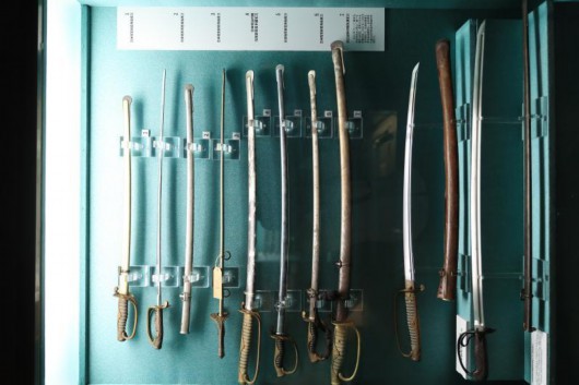 其中包括:百人斬”殺人屠刀,此把日本陸軍九八式軍刀,系“南京軍事法庭”審判南京大屠殺的劊子手向井敏明和野田毅時(shí)的呈堂證物;侵華日軍屠殺中國(guó)軍民的九八式軍刀;1937年“八·一三”淞滬會(huì)戰(zhàn)期間,名為櫻井的日本海軍兵曹長(zhǎng)作為出征紀(jì)念的陸軍九五式軍刀和刀箱;第一次世界大戰(zhàn)期間日本航空隊(duì)佩刀等。
