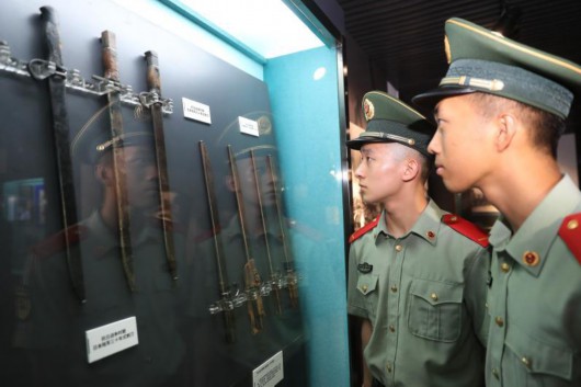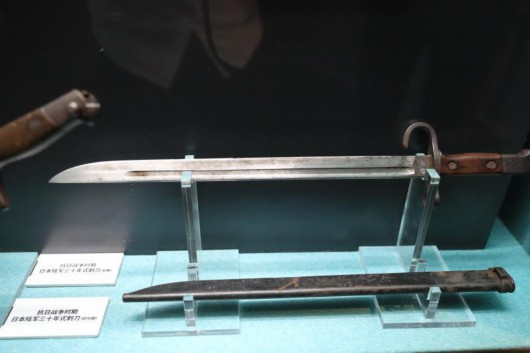 當(dāng)天,《侵華日軍暴行實(shí)物罪證展》揭幕。集中展出了侵華日軍的各類裝備、軍用品及相關(guān)文獻(xiàn)、繪畫作品等共81件。其中,日軍不同兵種使用的刀具58把,這些沾著中華兒女鮮血的屠刀,是侵略者罪惡果果的物證,是不可抹煞的鐵證。其他23件文物也從不同的側(cè)面反映了侵華日軍的滔天罪行,是中華民族災(zāi)難深重的歷史見證。