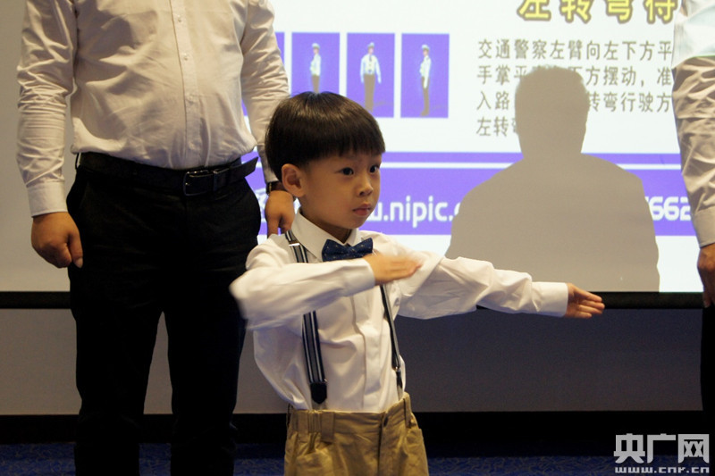 ▲家長和孩子一起學(xué)習(xí)交通指揮手勢(央廣網(wǎng)發(fā) 滴滴提供)