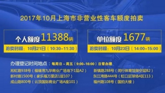上海國(guó)拍公司今早發(fā)布,10月份車牌拍賣安排在10月21日(10:30-11:30)舉行,個(gè)人額度11388輛,比上月減少1025輛。