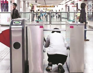 和最早的“三桿式”閘機不同,為了更方便乘客通過閘機,同時減少設(shè)施占地面積,近年來滬上地鐵車站新設(shè)了“門式閘機”,以左右兩扇小門取代“三桿式”。這種“門式閘機”的底部縫隙也比“三桿式”明顯縮小,客觀上增大了逃票者“鉆”過閘機的難度。目前在地鐵虹橋火車站站,“門式閘機”也已安裝到位。不過,對于逃票人來說,為了逃過幾塊錢,不惜用“吃相難看”的“奇葩”動作來化解“難題”。
