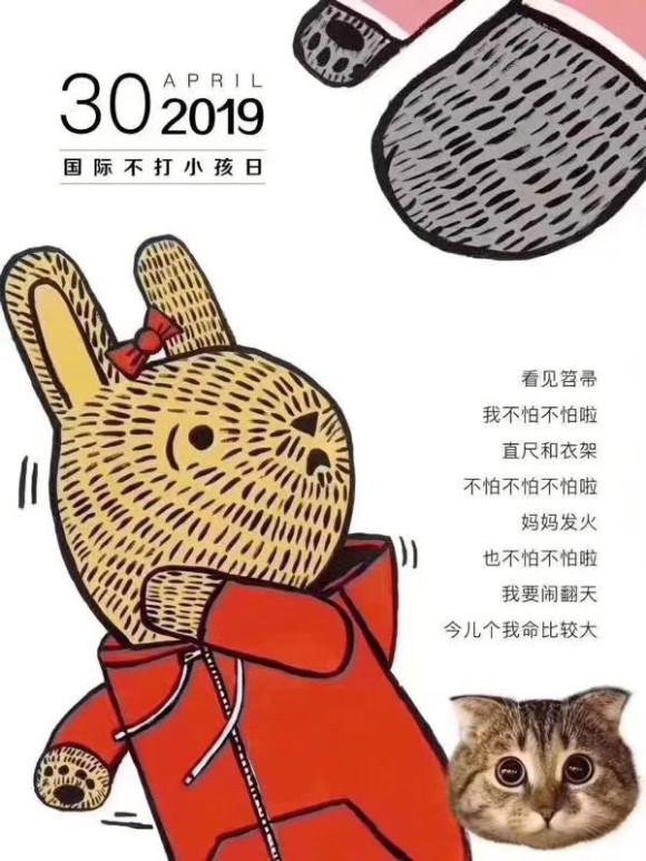 看見笤帚,我不怕不怕啦;直尺和衣架,不怕不怕不怕啦。媽媽發(fā)火,也不怕不怕啦,我要鬧翻天,今兒個我命比較大。”今天(4月30日)除了是五一小長假之前的最后一天工作日,更是“小調(diào)皮搗蛋們”的“赦免日”——“國際不打小孩日”,戲稱“無巴掌日”