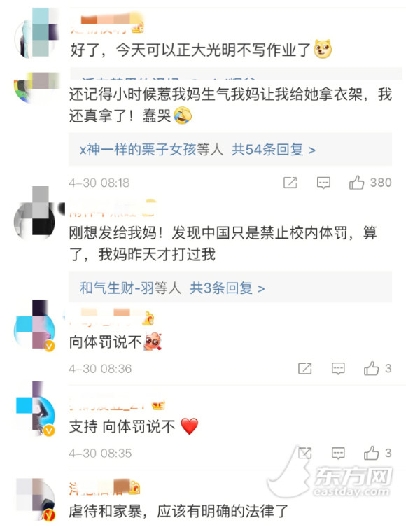 雖然“國際不打小孩日”家長們認(rèn)同度不高,但在孩子們看來,“國際不打小孩日”似乎給了他們提供了一個“淘氣”的理由。不少學(xué)生網(wǎng)友在網(wǎng)上評論:“好了,今天可以光明正大地不寫作業(yè)了”、“向體罰說不!”……網(wǎng)友“幽默大傻”還回憶了自己小時候挨打的“慘痛經(jīng)歷”,“小時候惹我媽生氣我媽讓我給她拿衣架,我還真拿了!”,網(wǎng)友“雨神早點睡”則表示“想早點發(fā)給我媽!昨天剛被打過!