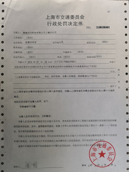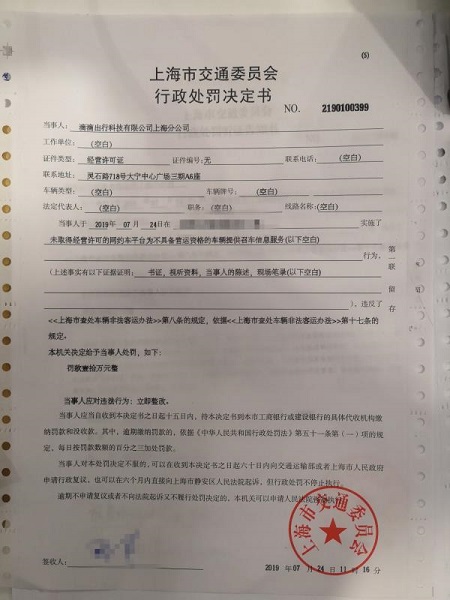 下午14:40,市交通委執(zhí)法總隊再次對“滴滴出行”上海分公司進行上戶執(zhí)法檢查,并通過監(jiān)管平臺的實時訂單數據進行線上執(zhí)法檢查。和上午一樣,隨機抽查10個訂單,又都是不合規(guī)車輛。執(zhí)法部門再次立案處罰,并于16:29開具了今天的第二張《行政處罰決定書》,同樣是罰款100000元,并要求對違法行為立即整改。