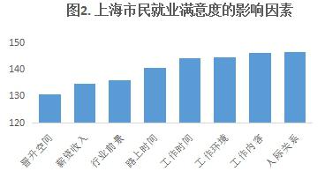 從影響就業(yè)滿意度的不同因素來(lái)看,上海市民對(duì)工作單位的人際關(guān)系滿意度最高,達(dá)146.4;市民對(duì)于工作內(nèi)容、工作環(huán)境、工作時(shí)間等因素的滿意度也相對(duì)較高,均高于總體滿意度。