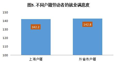 從不同戶籍勞動(dòng)者的就業(yè)滿意度來(lái)看,上海戶籍勞動(dòng)者的就業(yè)滿意度為142.2,外省市來(lái)滬人員的就業(yè)滿意度為142.8,兩者之間的差距微乎其微。