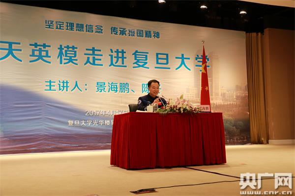 央廣網(wǎng)上海4月17日消息(記者傅聞捷 韓曉余)今天(17日),神舟十一號載人飛行任務(wù)乘組航天員景海鵬、陳冬走進(jìn)復(fù)旦大學(xué),與青年學(xué)生分享了他們的飛天歷程和航天夢想,吸引了復(fù)旦大學(xué)近500位師生現(xiàn)場參加了報(bào)告會(huì),另有四個(gè)校區(qū)近2000名師生通過視頻直播同步參加報(bào)告會(huì)的學(xué)習(xí)。