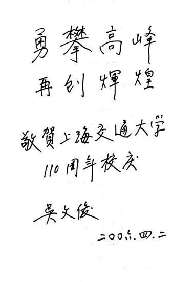 吳文俊學(xué)長長期以來一直關(guān)心、關(guān)注母校發(fā)展。2006年,上海交通大學(xué)110周年校慶時(shí),吳文俊學(xué)長擔(dān)任校慶顧問委員會主任委員并為母校題詞“勇攀高峰再創(chuàng)輝煌”,表達(dá)了深切祝福和美好寄愿。