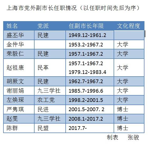 從上海的情況看,自解放后上海市政府成立以來,除革委會一段(1967—1979),其余均有黨外人士任職副市長。至今,上海已有10名來自黨外的副市長。