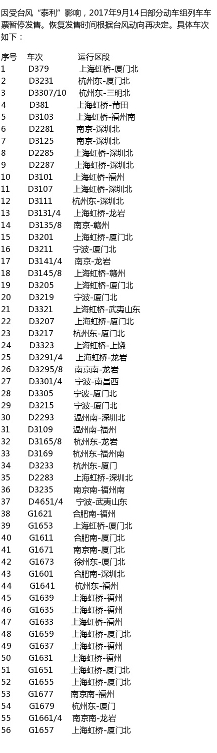 據(jù)上海鐵路局官方微博,因受臺(tái)風(fēng)“泰利”影響,2017年9月14日部分動(dòng)車組列車車票暫停發(fā)售;謴(fù)發(fā)售時(shí)間根據(jù)臺(tái)風(fēng)動(dòng)向再?zèng)Q定。